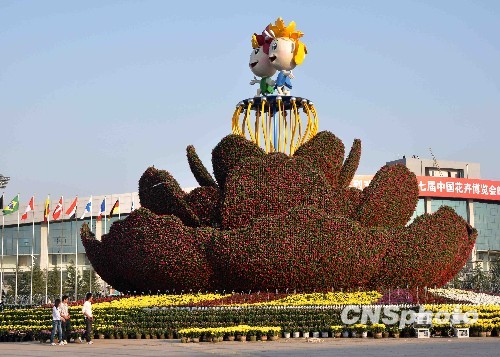 9月22日,游人在巨型“牡丹”花卉造型前走过。山东省青州市在国际会展中心广场布置搭建一座23.8米高的巨型牡丹花卉造型,为庆祝建国六十周年和第七届中国花卉博览会营造了浓厚的喜庆氛围。中新社发 王继林 摄