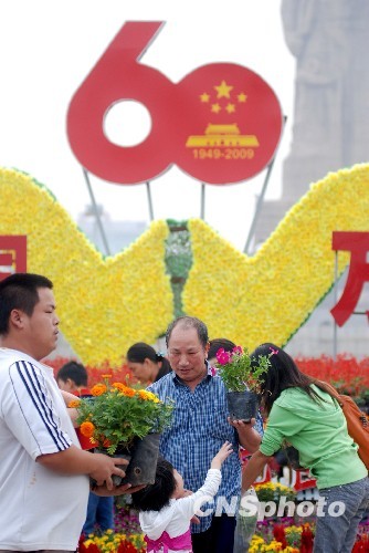 10月11日下午,在湖南省株洲市某广场上,许多市民将还未撤展的鲜花盆栽拎走。据悉,该广场为庆祝国庆,布置了许多装饰性花坛以营造节日气氛。