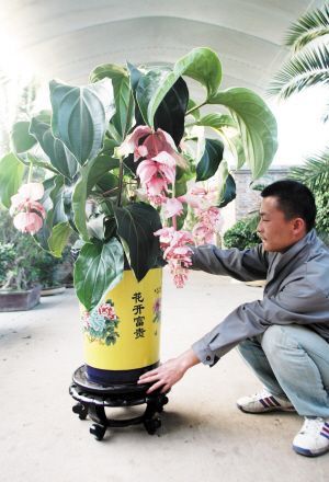 昨日,记者在东丽区大顺花卉园区看到了这几盆载誉而归的“金花”。其中一盆名为宝莲灯的盆栽花卉上开出10个粉色花朵,花朵更是如小灯笼一般。花匠说,这种花一般只开3到5朵,经过特殊培育后可以开出近10朵。而且,这种花的每个花朵都很珍贵,价值高达500元。