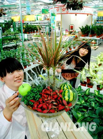 由三色铁柱、空气凤梨、红网纹草、黑珍珠等植物组合放在玻璃容器内,以小白石子、水草为辅料,树枝、水果蜡为装饰物,就形成了组合盆栽“丰收在望”。据世纪奥桥花卉超市总经理张向东介绍,这款组合盆栽通过艺术配置的手法,将多种观赏植物同植在一个容器内,在国内很少见。226元一盆的价格,也适合作为礼物送给亲朋好友。
