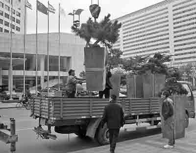 10日,市区四平路上,园林工作人员正在将价格不菲的盆景挪走,统一挪至棚内过冬。