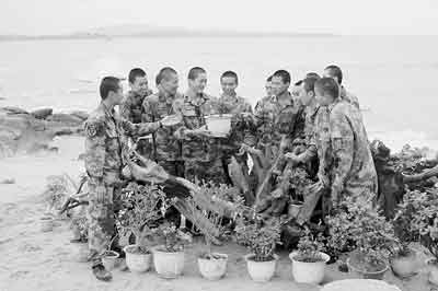 昨日,“东南第一哨”角屿两个哨所的官兵举办了一场小型“花博会”。因为远离大陆,信息相对闭塞,守岛官兵为丰富精神文化生活,在各自哨所种上盆景,从沙滩拾来贝壳、树根,或镶嵌成五环图,或拼装成 “祖国在我心中”等字样,或制成形态各异的工艺品、根雕,虽谈不上工艺精美,却也能自娱自乐。士官刘兵介绍说:“四季杜鹃娇气得很,只能呆在盆子里。” (王良军)