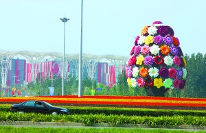 沿着京顺路到达顺义枯柳树环岛,一个十几米高的巨大花束矗立在环岛正中,把整条道路点缀得分外绚丽。绕着环岛向西,红白相间的巨大建筑群就掩映在绿树花海之中,这里就是花博会的主场馆北京国际花卉物流港。