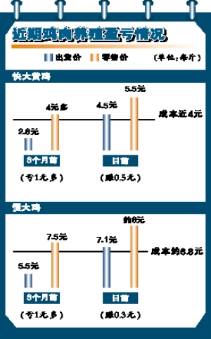 广东农之道农牧科技有限公司董事长欧显华在接受记者采访时表示,以快大黄鸡为例,3个月前鸡场出货价2.8元/斤,而鸡场的成本就接近4元/斤,鸡场卖一只鸡要亏4元~5元。“现在的出货价是4.5元/斤,当时每斤亏一元多,现在才赚0.5元,等于现在要养很多鸡,才能补回当时的亏损。”而出现价格回升,正是因为3个月前的触底价格让很多人都不养鸡了,现在的出货量少了。