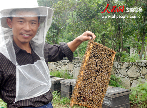 人民网安徽视窗讯 9月1日,在铜陵县钟鸣镇金山下,来自浙江衢州的养蜂人王向进正在为蜜蜂的秋季繁殖,腾笼换蜂王。