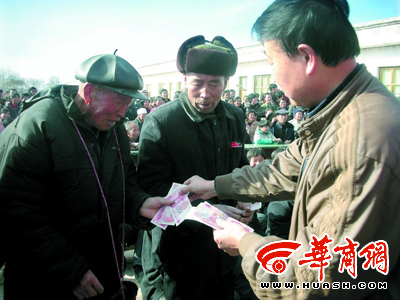 72岁的柳怀宾,看到村委会墙外的黑板上写着自己的名字时,禁不住乐了,他与另外65名老人一起,每人将领到300元的过年资助费。“为了家乡的发展,由我们村走出去的先富起来的人自发捐款捐物、献计献策,千方百计地增加家乡的造血功能,帮父老乡亲富裕起来。”横山县双城乡王梁村村委会村主任郝永春说,给这66名老人的资助费,就是这些人捐助的。