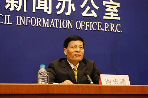 图为:谢伏瞻介绍07年国民经济运行情况 中国政府网 张泳 摄
