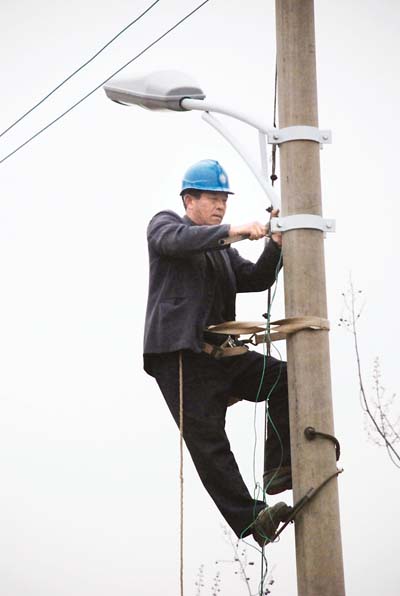 “烟草部门给俺村安装上路灯啦!”日前,潍坊市临朐县寺头镇于家庄村的一位村民高兴地说道。于家庄村是一个小山村,交通比较闭塞,百姓生产生活水平不高。2007年,该村被确定为烟叶生产生态村后,在临朐县局(分公司)的大力扶持下,村里的生产条件、村容村貌、交通状况等都有了明显改善。近期,临朐县局(分公司)利用冬季农闲时节组织施工人员为于家庄村安装上了路灯。图为施工人员正在安装路灯。
