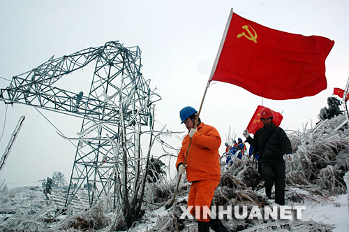 2月2日,南方电网党团员青年突击队赶赴被冰凌灾害扭曲的桂林电网电塔现场。新华社记者何丰伦摄