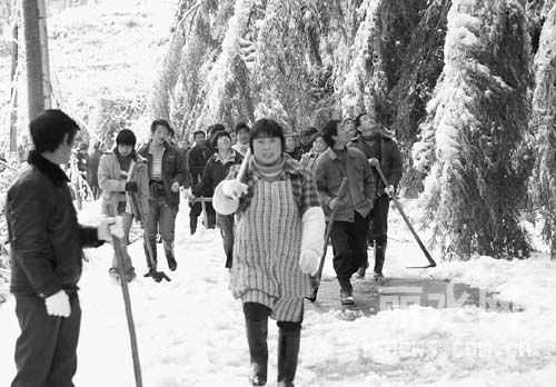 昨日,村民们自发扫。大给遂昌县高坪乡村民的生产生活带来了很大影响,当地村民在政府救灾的同时,积极开展生产生活自救,清扫道路和农作物上的积。 记者 朱丽勇 通讯员 王修华 摄