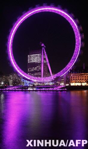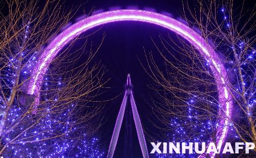 2月8日晚,英国首都伦敦的著名摩天轮“伦敦眼”被彩灯装饰得流光溢彩,异常美丽。 新华社/法新