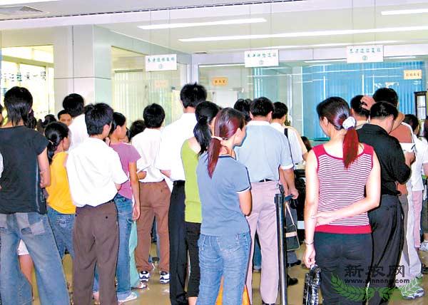 资料图片:东莞外来工在办理退保手续的窗口前排起了长龙.(广州日报)