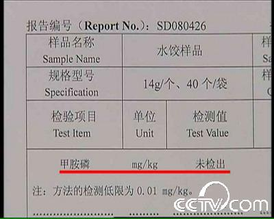 记者注意到,33份样品的检测内容包括饺子馅、饺子皮和包装袋内外侧。检测结果表明,所有的项目甲胺磷残留量都是未检出。根据以上的调查结果,中方调查组认定日本饺子中毒事件不是一起因农药残留问题引起的系统性的食品安全事件,而是一起人为投毒事件。