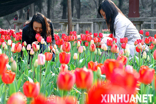 3月17日,两位游客在湖北省襄樊市隆中风景区欣赏郁金香。 近日,湖北襄樊春意浓浓,隆中风景区内郁金香盛开,吸引游客前来观赏。新华社发(安富斌摄)