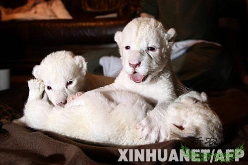 3月21日,在比利时奥尔门动物园,三只白狮幼仔嗷嗷待哺。三只白狮于上周在奥尔门动物园出生。新华社/法新
