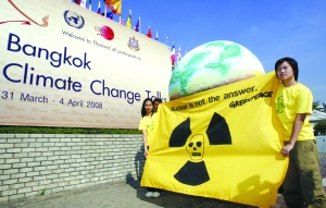 3月31日,曼谷,在曼谷气候变化大会期间,泰国绿色和平环保组织人员站在联合国驻曼谷总部外,条幅上写着“核不是答案”。