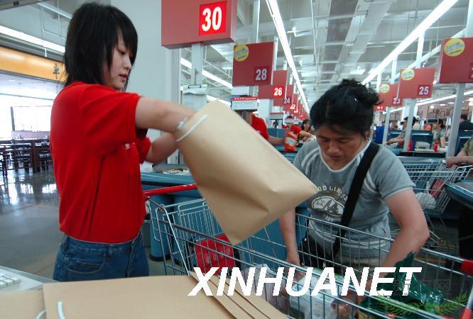 2007年6月24日,超市收银员帮助顾客将购买的商品放入纸质购物袋。当日,北京市石景山区环保局开展的“少用一个塑料袋”环保主题宣传活动在当地一家超市内举行。活动中,超市工作人员共向顾客发放纸质购物袋2000多个。新华社记者李俊东摄