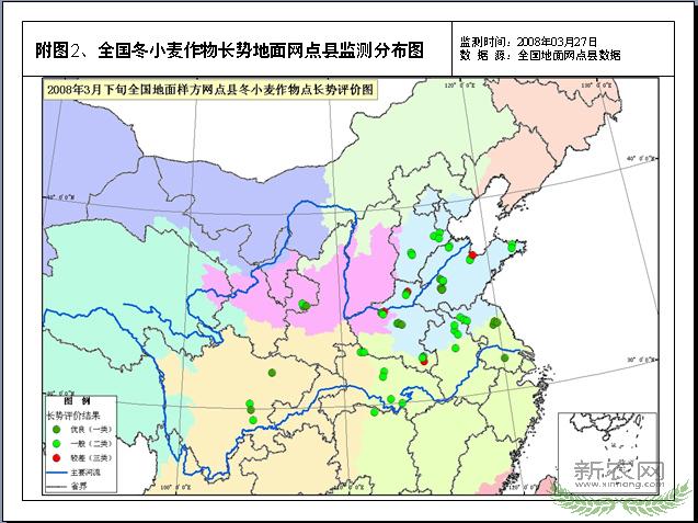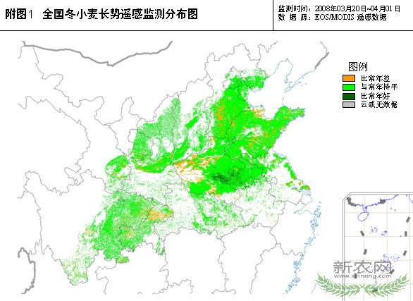 目前,华北、西北产区冬小麦处于返青生长末期,华中、华东产区处于拔节生长阶段,西南产区已经进入抽穗阶段。据农业部卫星遥感与地面网点县监测:自3月19日以来,全国冬小麦长势总体正常,其中86.2%的冬小麦长势与常年持平,2.1%长势好于常年,11.7%的长势不及常年。与上期监测相比,全国冬小麦长势不及常年的比例下降7.4个百分点。