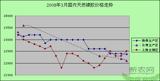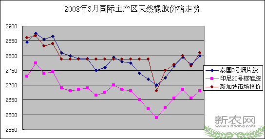 根据农业部农垦局(农业部发展南亚热带作物办公室)监测,3月份泰国3号烟片胶(RSS3)和印尼20号标准胶(SIR20)价格一路下滑,月末止跌回升,全月呈振荡下跌的态势。而国内产销两地国产5号标准胶(SCR5)现货价格也跟随国外现货价格走势,全月波动幅度较大。产区成交量少,销区成交较为活跃。