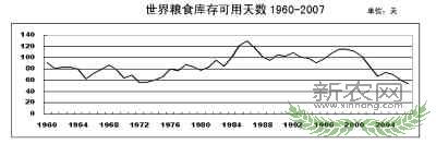 再者,粮食库存将继续下降。世界粮食产量在近8年中有7年低于消费量,供求缺口由库存弥补,导致粮食库存降至历史新低,仅能满足54天全球消费。从1960年以来的数据看,世界粮食库存并不十分稳定。可分为增加、平稳和下降3个阶段:增加阶段为1972—1986年,这一阶段适逢冷战,出于政治、军事等多方面考虑,库存不断增加,至1986年达历史高点,可供世界消费130天;平稳阶段为1990—1999年,这10年间世界粮食库存保持高位平稳状态,虽略有调整,但总体在可供世界消费100天左右徘徊;下降阶段为2000年至今,库存可供世界消费天数从2000年的111天下降至2007年的54天历史低点。当前,人均产量稳步回升,供求差额由负向正发展,但库存“欠账过多”,整体仍处于下降阶段。