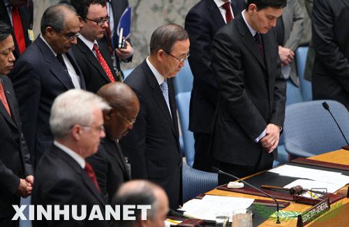 5月20日,在美国纽约联合国总部举行的联合国安理会会议上,联合国秘书长潘基文与安理会成员集体默哀,对中国四川汶川大地震遇难者表示哀悼。新华社记者侯俊摄