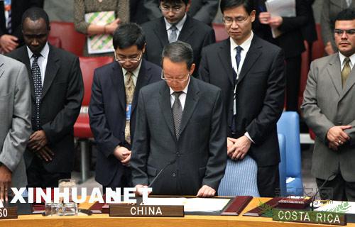 5月20日,在美国纽约联合国总部举行的联合国安理会会议上,中国常驻联合国代表王光亚(前中)与安理会成员集体默哀,对中国四川汶川大地震遇难者表示哀悼。新华社记者侯俊摄
