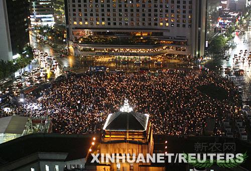 6月3日,韩国民众在首都首尔举行大规模集会,抗议韩国政府关于进口美国牛肉的政策。韩国总统李明博当天说,鉴于民众反对,韩国政府将不会按照原有韩美协议恢复进口月龄30个月以上的美国牛肉。韩国政府官员同一天称,韩方已请求美方就此考虑修改协议中的原有条款。新华社/路透