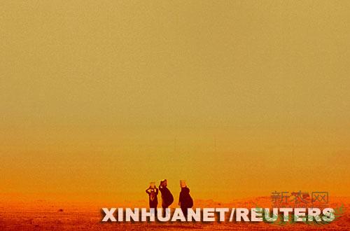 2003年4月16日,在伊拉克第二大城市巴士拉市郊,几名伊拉克妇女头顶水罐在沙尘暴中艰难前进。
