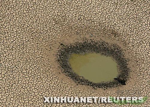 2005年10月26日,因巴西亚马孙河流域遭遇严重干旱,一头牛正在接近干涸的库鲁阿伊湖湖底喝水。新华社/路透
