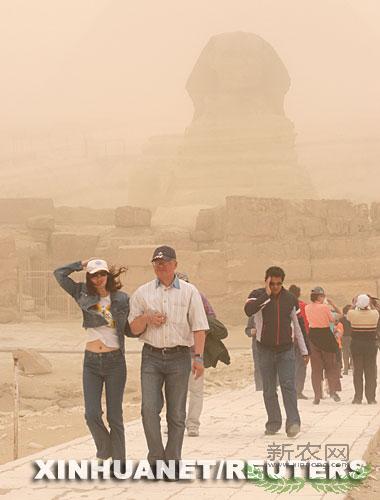 2006年3月7日,在埃及首都开罗郊外的狮身人面像前,游客行走在沙尘暴中。新华社/路透
