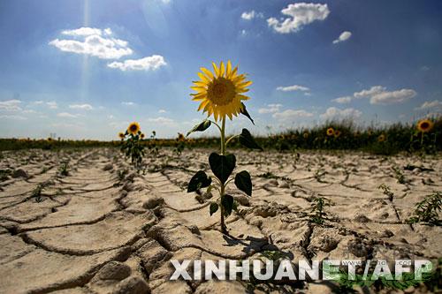 2006年8月2日,在西班牙城市昆卡城郊,向日葵生长在极度干旱的田地里。新华社/法新