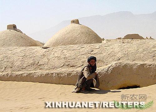 2002年8月11日,在马扎里沙里夫附近的一个村庄,一名阿富汗男子守在几乎被沙子埋没的家门口(右侧可见)旁。新华社/路透