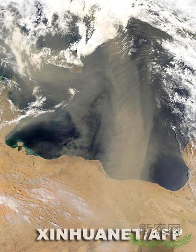 这张2002年5月13日由美国国家航空航天局公布的卫星云图显示,被大风从利比亚卷起的黄沙正向地中海飞去。新华社/法新