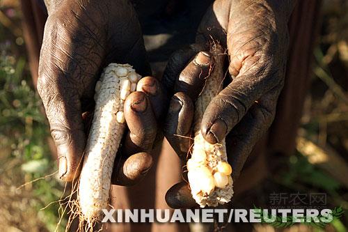 2002年5月25日,在距离马拉维首都利隆圭30公里的一片农田里,一名农民展示因干旱几乎绝收的玉米棒。新华社/路透