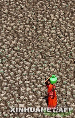 2003年6月6日,在印度安得拉邦海德拉巴郊区,一名妇女顶着水罐走过干涸的奥斯曼萨格尔湖。新华社/法新
