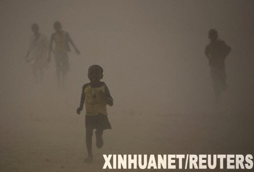 6月19日,在乍得东部的一个难民营,一名小男孩在沙尘暴中奔向自己的住所。