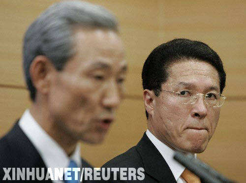 6月21日,韩国农林部长官郑云天(右)和韩美自由贸易协定谈判代表金宗埙在首尔出席有关美国牛肉进口问题的新闻发布会。韩国政府当日宣布,美国已与韩国达成共识,将仅向韩国出口月龄在30个月以下的牛的牛肉。新华社/路透
