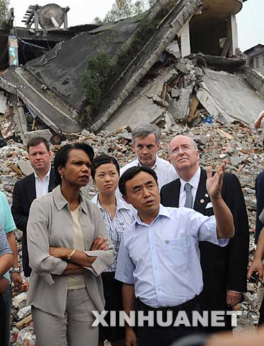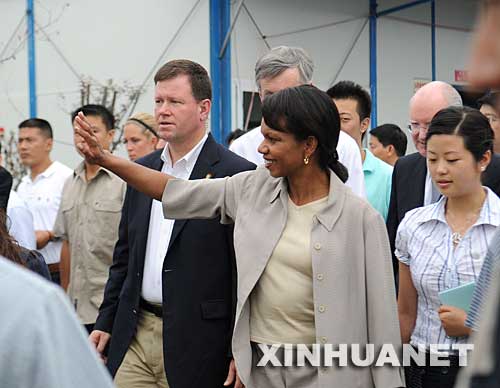 当日,正在中国访问的美国国务卿赖斯前往地震灾区四川都江堰市,参观废墟,慰问安置点的受灾群众。新华社记者陈铎摄