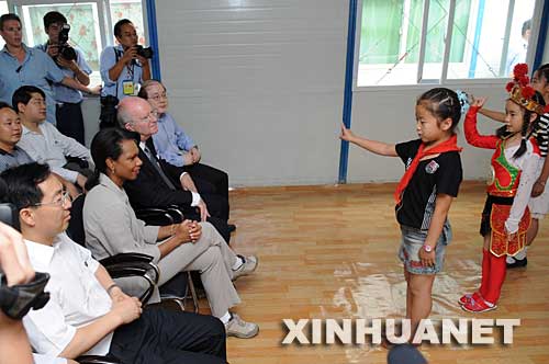 6月29日,美国国务卿赖斯(前左二)在都江堰市“勤俭人家”受灾群众安置点观看小朋友的表演。新华社记者陈铎摄