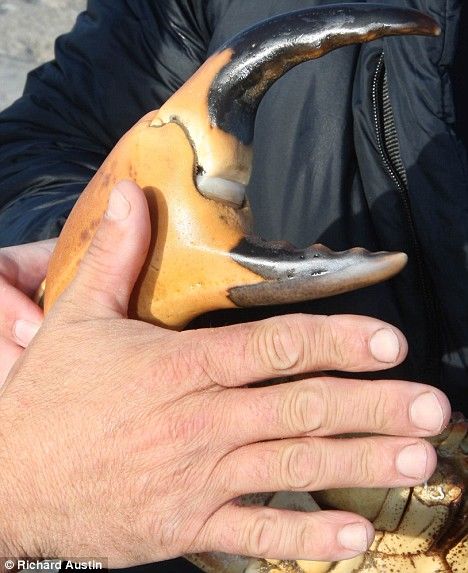 保罗正在认真展示着这对异常庞大的蟹钳。