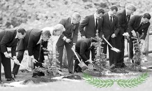 7月8日,意大利总理贝卢斯科尼、英国首相布朗、德国总理默克尔、美国总统布什、日本首相福田康夫、法国总统萨科齐、俄罗斯总统梅德韦杰夫、加拿大总理哈珀和欧盟委员会主席巴罗佐(从左至右)在植树典礼上。当天,在日本洞爷湖出席八国峰会的领导人在峰会主会场温莎饭店参加了一个植树典礼。