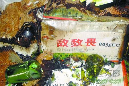 瓶装的农药爆炸后,火苗随农药液体四处蔓延。