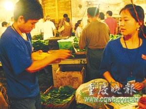 昨日早上七时至下午五时,来自重庆工商大学融智学院管理系大一的八名学生,和两位在沙区土湾模范村农贸市场卖