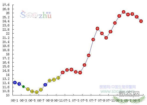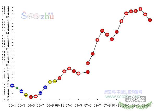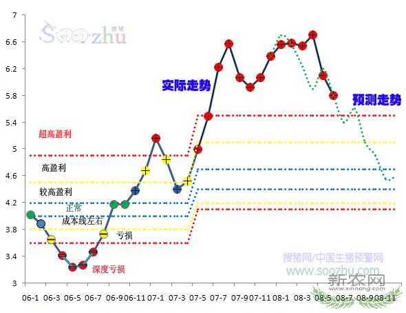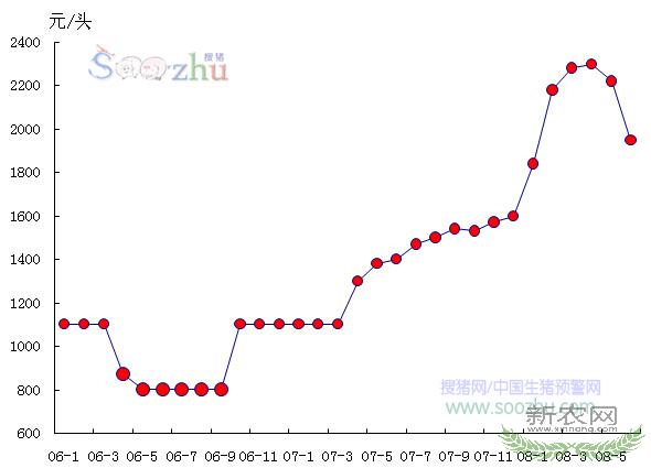 2008 年上半年全国活猪平均价格在罕见高位创造了新的历史, 4月份前后,全国出栏活猪平均价格达 17元 /公斤左右。上海、浙江、福建、广东等部分地区甚至冲破 20元 /公斤大关。然而, 4月份过后,全国毛猪平均价格却呈现快速下跌势头,至 6月底已跌至 15.6元 /公斤左右。且随着出栏量的增加仍将继续回落。