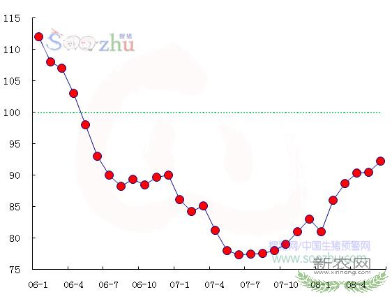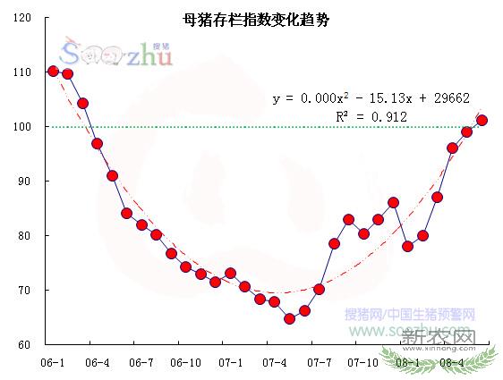 由于某些因素,有关部门公布的母猪存栏量数据可能与实际情况仍存在偏差。尽管生猪总存栏指数显示,存栏仍旧不足,但这并不意味着母猪存栏量也不足。因为生猪的生物学特性决定了母猪存栏与总存栏之间需要一个 “传输 ”的时间。因此我们通过调查评估以及进行二次回归分析得到母猪存栏指数变化趋势图。