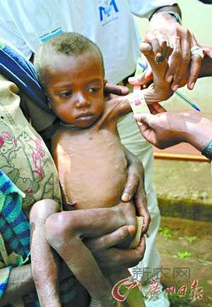 埃塞俄比亚一营养不良的儿童在接受医疗人员的诊治。
