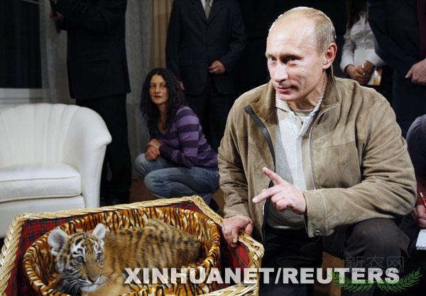 10月10日,俄罗斯总理普京在首都莫斯科郊外的住所展示他的生日礼物——一头两个月大的虎崽。