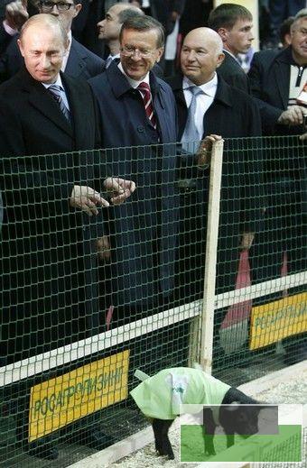 俄联邦体育养猪业协会副主席科尔恰诺娃向总理介绍了小猪“运动员”经常参加国际比赛取得的佳绩,同时向普京赠送了一件绘有体育养猪业协会会标的小猪参赛背心。