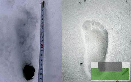 日本探险小组发现的雪人脚印(左)与人类脚印对比。