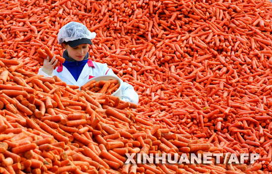 这张2008年10月17日拍摄的资料照片显示,德国东部一家冷冻食品厂的职员对胡萝卜进行质量抽检。